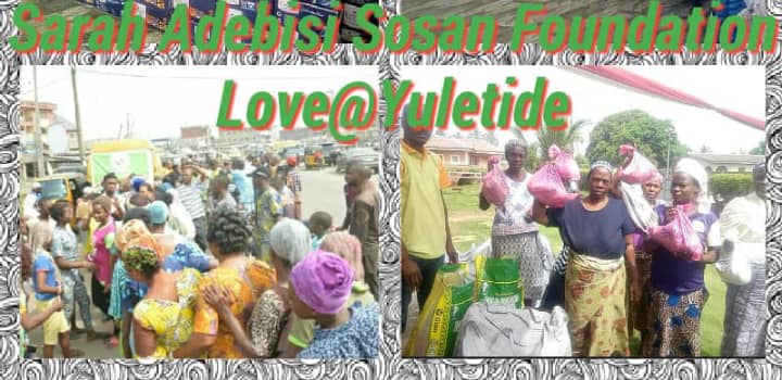 December, a month of celebration and exchange of gift, a time of happiness and counting God’s blessing for the year for most people. This period is also a time of unhappiness to people in rural communities as they have little or nothing to celebrate with. In light of this, Sarah Adebisi Sosan foundation embarked on Food Support Program for 1000 families in Ojo town and the rural riverine communities of Ojo Local government in Lagos State with the intention of putting food in the bellies of families and smiles faces, giving them reasons to be thankful and a ‘’December to remember’’. The program was held on the 22nd and 24th of December, 2018 respectively. The program was covered by Lagos State Television and Newspapers.